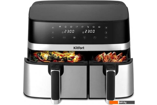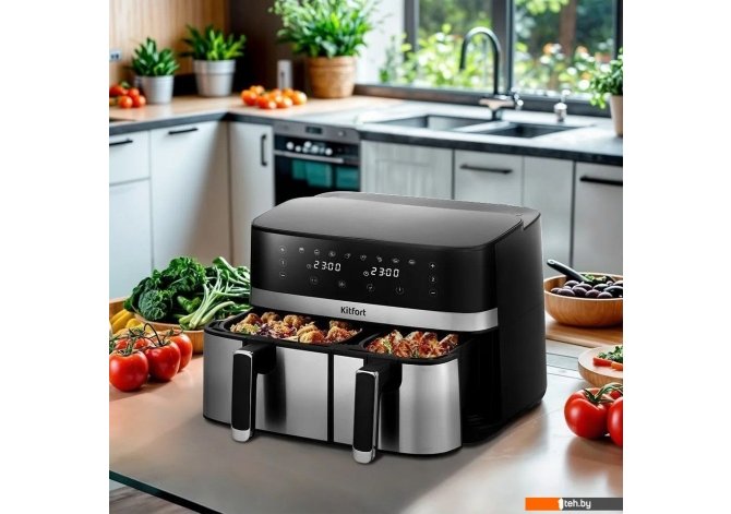 | Информация | Современный аэрогриль КТ-2261 имеет стильный дизайн и 2 поддона. Позволяет готовить несколько блюд одновременно с минимальным количеством масла или вовсе без его добавления! Аэрогриль оснащен сенсорным управлением, он имеет 8 автоматических программ и синхронизацию приготовления. В аэрогриле можно установить время таймера 1—60 минут с шагом 1 минута, а также температуру приготовления 80—200 °С с шагом 5 °С. Благодаря двум поддонам разной ёмкости вы можете готовить 2 разных блюда одновременно, установив при этом для каждого свои настройки температуры и таймера. Вы можете приготовить основное блюдо и гарнир к одному времени и подать к столу горячими. Продукты готовятся на специальных решётках, установленных в поддоны. Решетки и поддоны имеют антипригарное покрытие. По окончании приготовления аэрогриль автоматически отключается. Поддоны и решётки легко вынимаются и моются. При помощи системы циркуляции горячего воздуха продукты равномерно обжариваются со всех сторон и получаются нежными внутри и с хрустящей корочкой снаружи. При приготовлении в аэрогриле продукты практически не пригорают. |