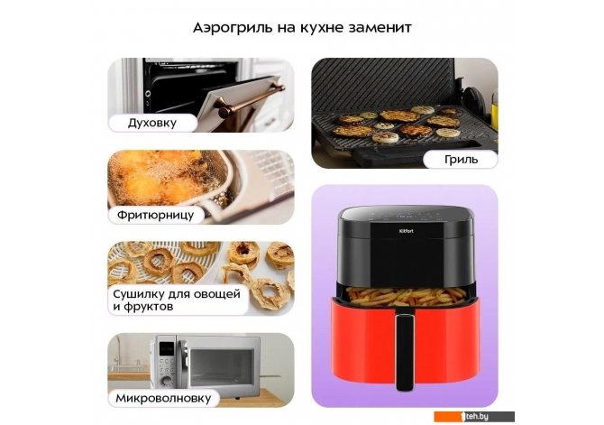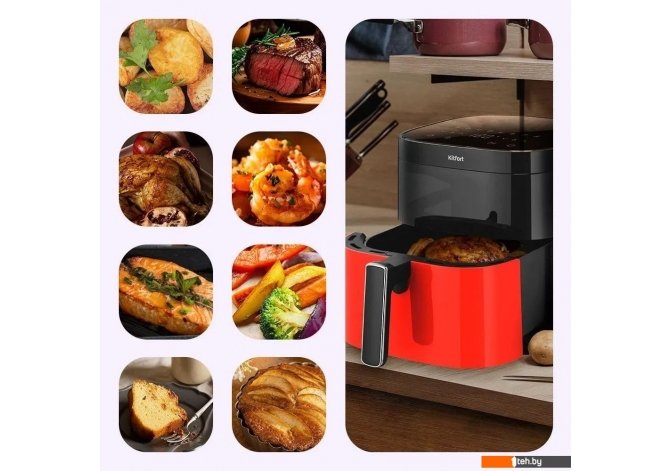 | Информация | Аэрогриль КТ-2291 — универсальное устройство, которое позволяет готовить разнообразные блюда. Подходит для приготовления большинства блюд без масла: картофеля, мяса, рыбы, птицы, овощей, выпечки и др. Может использоваться как сушилка для овощей и фруктов. Аэрогриль КТ-2291 станет достойной заменной духовки, грилю, фритюрнице, микроволновке и сушилке для овощей и фруктов, что отлично поможет сэкономить вам место на кухне. А одновременная подача разных блюд сделает процесс готовки гораздо быстрее и эффективнее. В аэрогриле есть специальная программа для сушки овощей и фруктов с таймером от 1 до 24 часов с шагом 1 час и температурой 80 градусов, что идеально подходит для сушки овощей и фруктов! При помощи системы циркуляции горячего воздуха продукты равномерно обжариваются со всех сторон и получаются нежными внутри и с хрустящей корочкой снаружи. При готовке продукты практически не пригорают, а сам процесс не требует постоянного присутствия. Аэрогриль имеет 8 автоматических программ. А используя сенсорную панель управления, вы можете настроить нужный нагрев вручную от 80 °C до 200 °C , время приготовления от 1 до 60 минут. В инструкции представлены рецепты разнообразных блюд. Съёмный поддон и решётка имеют антипригарное покрытие, благодаря чему они легко чистятся после использования, а блюда можно готовить практически без добавления масла. |