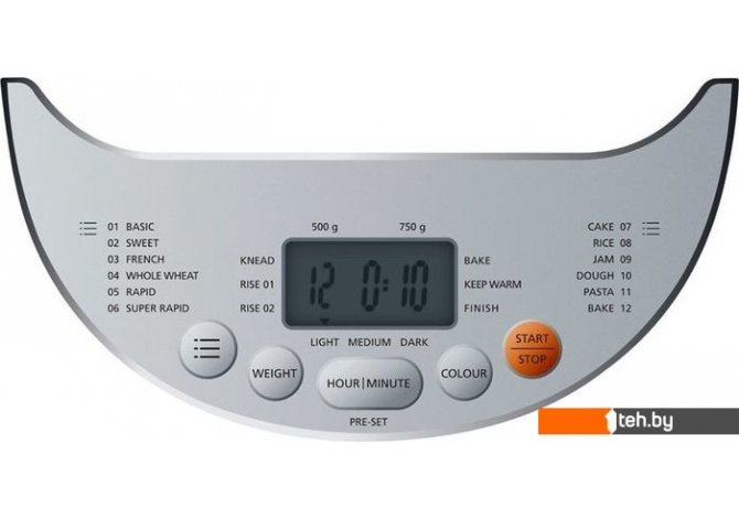 | Перечень режимов работы | базовая, сладкий хлеб, французский хлеб, цельнозерновой хлеб, быстрое приготовление, сверхбыстрое приготовление, кекс, джем, тесто, и др. |