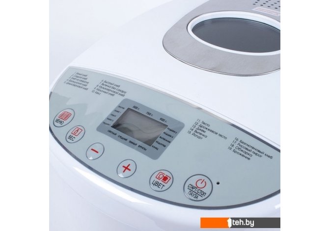 | Перечень режимов работы | французский хлеб безглютеновая выпечка кекс сладкая выпечка варенье йогурт белый хлеб замес теста цельнозерновой хлеб |