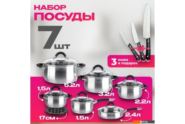 | Состав набора | сковорода (1 шт.), кастрюля (4 шт.), ковш (1 шт.), подставка под горячее (1 шт.), крышка (6 шт.), нож (3 шт.) |