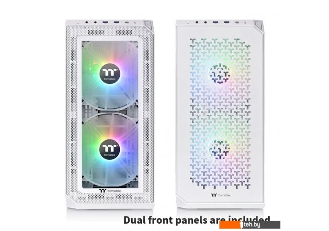 | Информация | Корпус с двумя сменными передними панелями - одна из закаленного стекла, а другая из метала с перфорацией в виде логотипов компании. Для эффективного охлаждения всех комплектующих вашего ПК, View 300 MX с завода комплектуется двумя предустановленными 200-мм ARGB ШИМ вентиляторами спереди и одним 120-мм ARGB ШИМ вентилятором сзади. Корпус View 300 MX Mid-Tower призван вывести полюбившуюся линейку View на новый уровень. С завода комплектуется двумя сменными передними панелями, одна из закаленного стекла, а другая из метала с перфорацией в виде логотипов компании. Для красивого и эффективного охлаждения начинки вашего компьютера в корпусе уже установлены 200-мм ARGB ШИМ вентиляторы спереди и одним 120-мм ARGB ШИМ вентилятором сзади. Кроме того, View 300 MX имеет поворотные слоты PCI-E, съемные фильтрующие элементы, съемный кожух БП, поддержку мат. платы с форм-фактором E-ATX (12" x 13") и радиаторов размером до 360-мм спереди, сверху и со стороны мат. платы.. Благодаря таким достоинствам, View 300 MX становится отличным выбором, чтобы сделать вашу следующую сборку эпичной, высокопроизводительной и уникальной. Для красивого и эффективного охлаждения начинки вашего компьютера в корпусе уже установлены 200-мм ARGB вентиляторы спереди и одним 120-мм ARGB вентилятором сзади. Благодаря ШИМ управлению, скорость вращения вентиляторов будет меняться в зависимости от температуры, это значит, что при низкой нагрузке уровень шума будет минимальным. Подсветкой же можно управлять при помощи встроенного контроллера с физической кнопкой, нажимай которую, можно выбрать желаемый световой профиль, либо переключится на управление контроллером материнской платы. В комплект поставки входят две передние панели: одна из закаленного стекла, обеспечивающая превосходный внешний вид, а другая - из перфорированной стали с вырезами под логотип TT для лучшего воздушного потока. Выберите именно тот вариант, который подойдет вашему стилю или назначению ПК. 4-миллиметровая боковая панель View 300 MX из закаленного стекла отличается большей устойчивостью к царапинам, чем стандартный акрил. Кроме того, через него отчетливее видно всё великолепие вашей сборки, особенно с включённой RGB подсветкой. Запатентованные поворотные слоты PCI-E позволяют устанавливать видеокарту вертикально. Такая конструкция, по сравнению с более традиционным подходом 7+2, практически не ограничивает толщину видеокарты. *Входящий в комплект нижний кронштейн для видеокарты поддерживает только кабели-удлинители (райзеры) с прямым интерфейсом PCI-Е. Справа, сверху и снизу расположены фильтрующие элементы, обеспечивающие отличную защиту от грязи и пыли, которые легко снимаются для очистки. Чтобы система выглядела максимально аккуратно, встроенная крышка блока питания предназначена для скрытия неприглядных кабелей. Кроме того, это помогает оптимизировать воздушные потоки и улучшить качество охлаждения. Производительность охлаждения View 300 MX превосходна благодаря двум 200-мм вентиляторам ARGB ШИМ спереди и одному 120-мм вентилятору ARGB ШИМ сзади. Перфорированная стальная панель с логотипом TT обеспечивает максимальный приток свежего воздуха, а панель из закаленного стекла с металлической сеткой по периметру также обеспечивает достаточно хороший забор воздуха. Тепловые изображения были сделаны во время испытания в термокамере. Благод