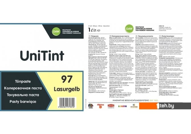Фотографии, описание и технические характеристики модели Alpina UniTint 1 л (№97 lasurgelb) взяты из открытых источников, официального сайта производителя или представительства Alpina в Республике Беларусь.
