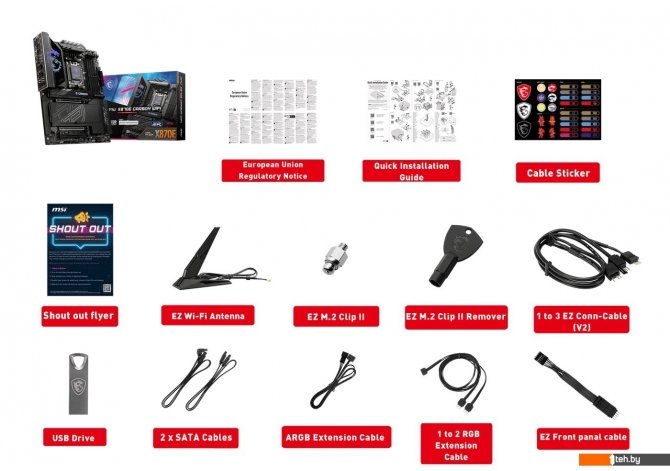 | Комплектация | Board • 1x Motherboard Documentation • 1x Quick installation guide • 1x European Union Regulatory Notices Application • 1x USB drive Cables • 2x SATA 6Gb/s cables • 1x 1 to 2 RGB extension cable • 1x ARGB extension cable • 1x 1 to 3 EZ Conn-Cable (V2) • 1x EZ Front panel cable Accessories • 1x EZ Wi-Fi Antenna • 1x Cable sticker • 1x EZ M.2 Clip II • 1x EZ M.2 Clip II Remover |