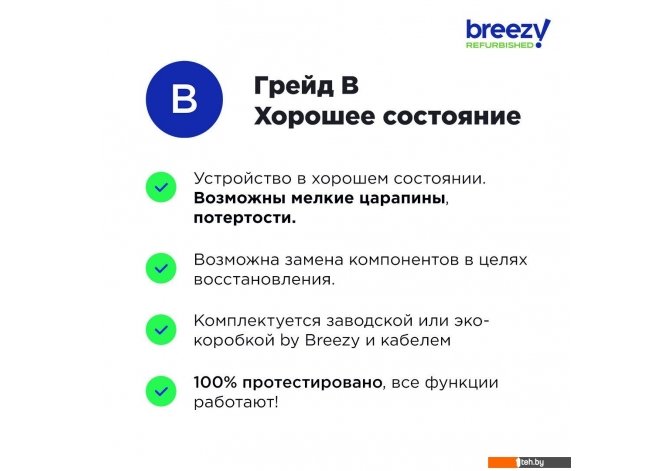 | Информация | Смартфон восстановлен по программе Breezy. Класс восстановленного устройства B. Класс устройства говорит о состоянии смартфона после восстановления. К классу B относятся устройства, которые находятся в хорошем состоянии. Возможны мелкие царапины, потертости, точечные сколы. Зарядное устройство отсутствует в комплектации с осени 2020 года. |