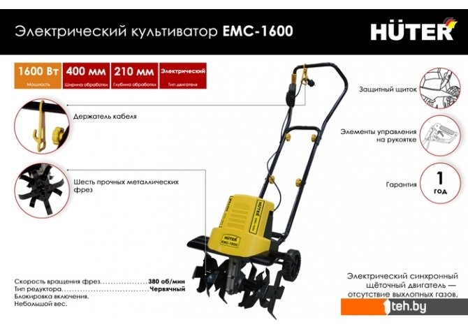 Фотографии, описание и технические характеристики модели мотоблока Huter EMC-1600 взяты из открытых источников, официального сайта производителя или представительства Huter в Республике Беларусь.