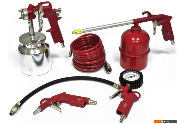 | Комплектация | - Краскопульт 1 шт. - Пневмопистолет продувочный 1 шт. - Пневмопистолет для накачки шин 1 шт. - Пневмопистолет повильный 1 шт. - Шланг спиральный 5м, нейлон 1 шт. |