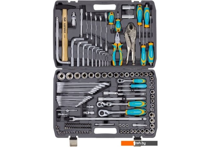| Комплектация | трещотка (3 шт.), отвертка (6 шт.), плоскогубцы (1 шт.), молоток (1 шт.), ключ гаечный (35 шт.), головки (55 шт.), насадки-биты (26 шт.), удлинители (8 шт.), кардан (3 шт.), держатель (1 шт.), адаптер (2 шт.), кейс (пластиковый) |