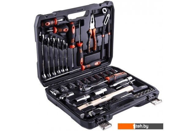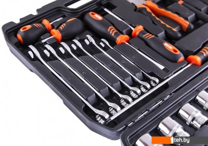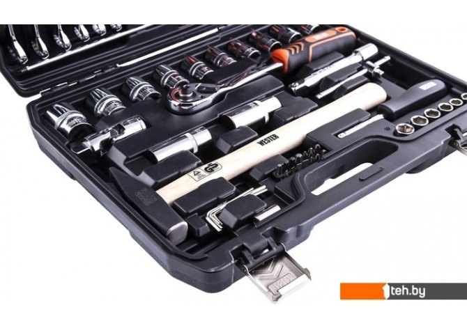 | Комплектация | - Головки торцевые 1/4" 6 граней: 8, 9, 10, 11, 12, 13 мм- Отвертка - держатель 1/4" 150 мм- Адаптер для бит 1/4"DR x 1/4"НDR- Биты: L = 25 мм PH1, PH2, PH3, SL3, SL4, SL5, SL6, Т10, Т15,Т20, Т25, Т27, Т30, Т40- Вороток Т - образный 1/4" 115 мм- Головки торцевые 1/2" 6 граней: 10, 12, 13, 14, 15, 17, 19, 22, 24, 27 мм- Свечные головки 1/2": 16, 21 мм- Трещотка 1/2" 72 зуба- Удлинитель 1/2" 125 мм- Кардан 1/2" 70 мм- Ключи шестигранные Г-образные: 1.5, 2, 3, 4 мм- Ключи комбинированные : 10, 12, 13, 14, 15, 17 мм- Молоток 300 г- Плоскогубцы комбинированные 175 мм- Переставные клещи 250 мм- Отвертки: PH2 x 38 мм, PH2 x 100 мм, PZ3 x 200 мм,SL6 x 38 мм, SL6 x 100 мм |