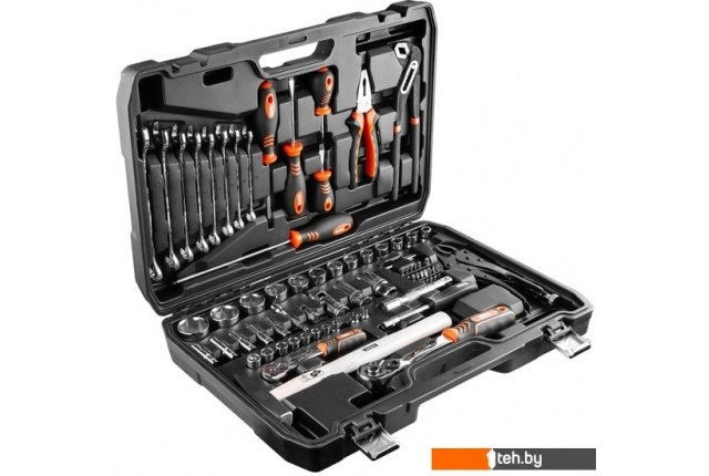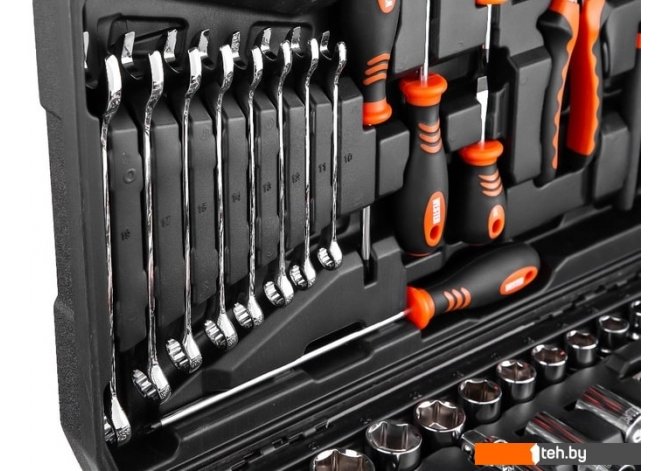 | Комплектация | - Головки торцевые 1/4" 6 граней : 4, 5, 6, 7, 8, 9, 10, 11, 12, 13 мм- Головки торцевые 1/4" глубокие, 6 граней: 5, 6, 7, 8, 10 мм- Трещотка 1/4" 150 мм 72 зуба- Кардан 1/4" 35 мм- Удлинитель 1/4" 75 мм- Отвертка - держатель 1/4" 150 мм- Адаптер для бит 1/4"DR x 1/4"НDR- Биты L=25 мм: РН1, PH2, PH3, SL3, SL4, SL5, SL6, Т10, Т15, Т20, Т25, Т27, Т30, Т40- Головки торцевые 1/2" 6 граней : 10, 11, 12, 13, 14, 15, 17, 19, 22, 24, 27, 30, 32 мм- Свечные головки 1/2": 16, 21 мм- Трещотка 1/2" 72 зуба- Удлинитель 1/2"DR 125 мм- Кардан 1/2" 70 мм- Ключи шестигранные Г-образные : 1.5, 2, 3 мм- Ключи комбинированные: 10, 11, 12, 13, 14, 15, 17, 19 мм- Молоток 300 г- Зажим с фиксатором 250 мм- Плоскогубцы комбинированные 175 мм- Клещи переставные 250 мм- Отвертки: РН2 х 38 мм, PH2 х 100 мм, PZ3 х 200 мм, SL6 х 38 мм, SL6 х 100 мм |