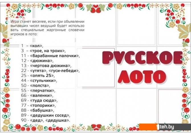 | Информация | Русское лото - это старинная русская игра, правила которой предельно просты и всем известны. Игра обрела популярность в 20 веке и стала единственной официально разрешенной азартной игрой в Советском Союзе. Суть игры состоит в том, чтобы первым закрыть определенное количество цифр на своей карточке. Русское лото делится на три вида: простое лото, короткое лото и лото "три на три". Играть можно на деньги или на интерес. |