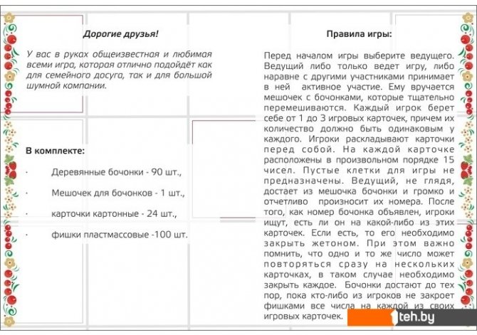 | Комплектация | деревянные бочонки с числами 1-90 в мешочке24 карточки100 пластмассовых фишекправила |