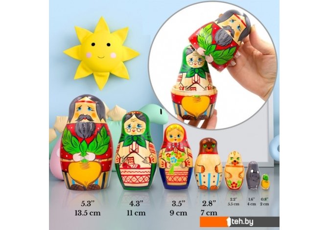 | Информация | ВЕЛИКОЛЕПНЫЙ ДИЗАЙН: Матрешки по мотивам русской народной сказки Репка ЭКОЛОГИЧЕСКИЕ МАТЕРИАЛЫ И ВЕРНОСТЬ ТРАДИЦИИ РОСПИСИ: натуральное дерево, краски и лак на водной основе УНИКАЛЬНЫЙ ПОДАРОК: оригинальный предмет декора для гостиной, спальни, детской, а также для офиса, салона ИДЕАЛЬНЫЕ РАЗМЕРЫ: высота самой большой матрешки 13.5 см, самой маленькой - 2 см |