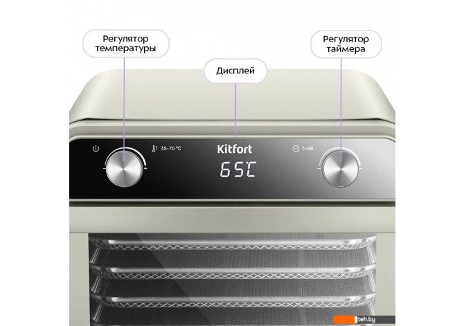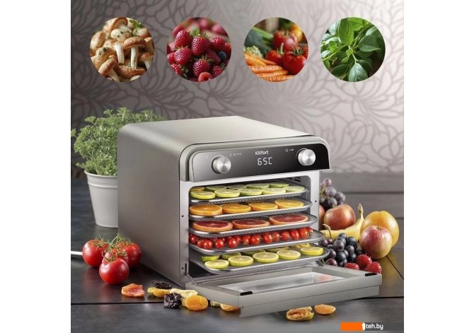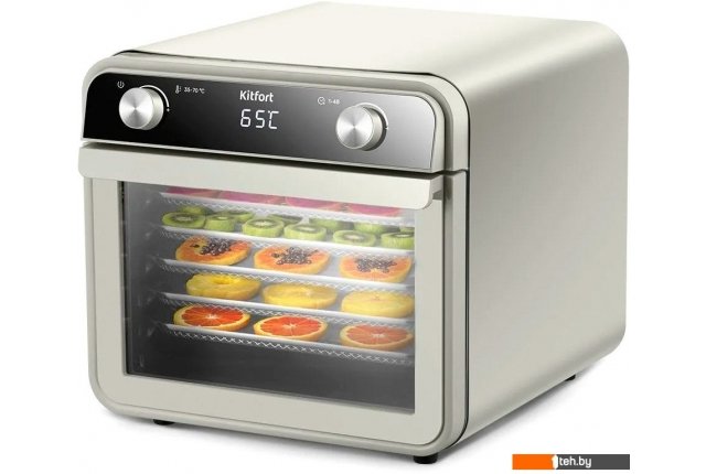 | Информация | -Сушилка для овощей и фруктов Kitfort KT-4951 – универсальное устройство для круглогодичной заготовки полезных и натуральных продуктов. Благодаря вместительной камере и пятиуровневой системе с различными поддонами, вы сможете сушить не только фрукты и овощи, но и мясо, рыбу, зелень, грибы и даже хлеб. Прибор станет отличным решением для тех, кто ценит здоровое питание и хочет готовить домашние снеки и заготовки на зиму. -Контроль процесса осуществляется с помощью электронного управления:можно точно установить температуру в диапазоне от 35 до 70°C с шагом 1°C и задать необходимое время работы с помощью таймера от 1 до 48 часов с шагом в 1 час. Встроенный вентилятор и нагревательный элемент обеспечивают равномерный горизонтальный обдув, что гарантирует одинаковую степень просушки на каждом уровне. -В комплект входят 5 металлических поддонов, 5 сеток и 5 пластиковых сплошных поддонов, каждый из которых предназначен для определённого типа продуктов. Металлические поддоны подойдут для сушки мяса, сетки – для мелких ягод и грибов, а пластиковые – для крупных фруктов или других нежирных продуктов. Эргономичная конструкция позволяет легко размещать и извлекать продукты. -Мощность 500 Вт обеспечивает эффективную сушку большого объёма продуктов за сравнительно короткое время. Компактные размеры устройства позволяют разместить его даже на небольшой кухне, а современный дизайн органично вписывается в любой интерьер. Kitfort KT-4951 – это надёжный помощник для любителей домашних заготовок и натуральных лакомств. |