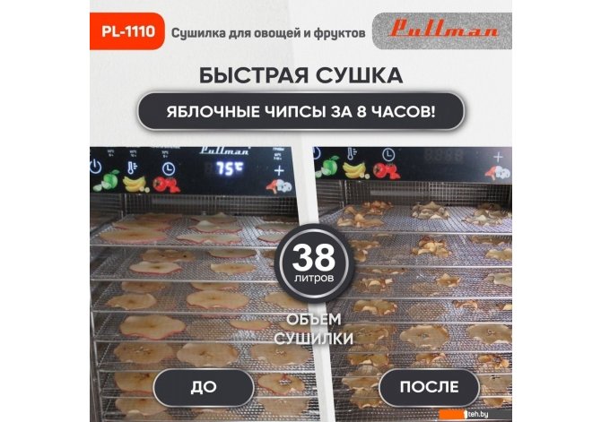 Если хотите купить сушилка для овощей Pullman PL-1110 то следует уточнить все параметры и габариты модели перед покупкой. Представленые характеристики на сайте 1teh.by могут отличаться от действительных или указанных производителем. Описание, фото товара и технические характеристики представлены для справки.