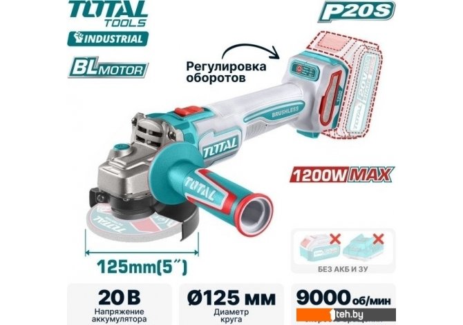 Фотографии, описание и технические характеристики модели болгарки Total TAGLI27153 (без АКБ) взяты из открытых источников, официального сайта производителя или представительства Total в Республике Беларусь.