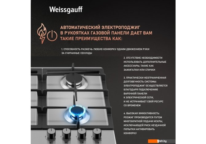 | Информация | - Новая встраиваемая газовая панель Weissgauff шириной 60 см предлагает 4 мощные конфорки, включая WOK-конфорку с трехконтурным пламенем. Она оснащена решетками из высококачественного чугуна, автоматическим электроподжигом и системой безопасности "газ-контроль". Элегантный дизайн из нержавеющей стали станет не только практичным решением для готовки, но и стильным акцентом в интерьере вашей кухни! - Ширина 60 см делает эту газовую панель идеальной для установки даже в компактных кухнях! - Нержавеющая сталь с защитным покрытием против отпечатков пальцев гармонично впишется в любой интерьер! - Решетки из чугуна обеспечивают надежность и долговечность, а их элегантный дизайн облегчает уход и чистку. Weissgauff уделяет внимание каждой детали, что гарантирует устойчивость и удобство в использовании! - WOK-конфорка с тремя кольцами пламени позволяет быстро нагревать даже крупную посуду, что делает процесс готовки еще более эффективным! - Система газ-контроля обеспечивает безопасность: если пламя погаснет, подача газа автоматически прекратится! - Поворотные рукоятки Hi-Tech придают модели современный вид и защищают от перегрева и деформации во время готовки. - Автоматический электроподжиг, встроенный в каждую рукоятку, позволяет быстро зажигать конфорки одним движением, без дополнительных приспособлений! |