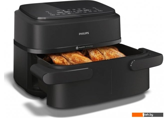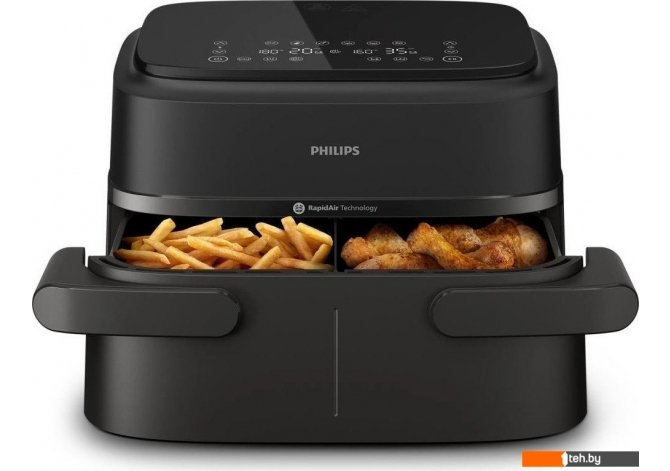| Информация | -Компактный аэрогриль Philips серии 1000 с двумя корзинами - отличное решение для быстрой и здоровой готовки дома. Благодаря технологии RapidAir и уникальному дизайну камеры в форме звезды вы сможете приготовить блюда с хрустящей корочкой и нежной серединой, используя на 90% меньше жира по сравнению с обычной фритюрницей. -Модель оснащена съемным разделителем, что позволяет использовать две корзины по 3.55 л каждая или объединять их в один большой лоток объемом 7.1 л. Это дает возможность одновременно готовить два разных блюда или одну большую порцию, например, целую курицу или до 900 г картофеля фри. -Аэрогриль экономит до 40% пространства на кухне, оснащен эргономичными ручками для безопасной переноски и прост в уходе:съемные детали имеют антипригарное покрытие и подходят для мытья в посудомоечной машине. Устройство поддерживает 6 автоматических программ и 10 способов приготовления, а также функцию подогрева. -Управление осуществляется через цифровой интерфейс, есть функция автоматического отключения, поддержание температуры и возможность синхронизировать время готовки в обеих корзинах. В комплекте – инструкция, экологичная упаковка и доступ к персонализированным рецептам в приложении HomeID. |