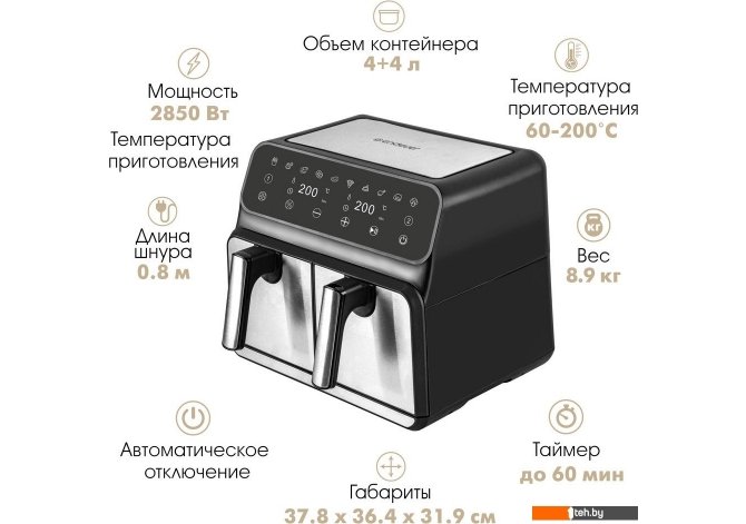 | Информация | - Аэрогриль Endever Skyline AF-128 - это идеальное решение для тех, кто ценит быстроту приготовления, качество и сохранение полезных свойств продуктов! С мощностью 2850 Вт и объемом каждой чаши по 4 литра, вы сможете легко приготовить большое количество блюд для всей семьи. - С аэрогрилем AF-128 вы сможете наслаждаться широким спектром возможностей - от жарки и запекания до тушения и подогрева. Диапазон температуры от 60 до 200 °C позволит вам выбрать оптимальный режим приготовления для любых ингредиентов. - Благодаря 2 чашам с антипригарным покрытием, вы сможете легко поддерживать чистоту и сохранять продукты без лишнего потребления масла. LED дисплей, 10 автоматических программ и таймер на 60 минут помогут вам контролировать процесс приготовления в режиме реального времени. - Сенсорная панель управления и возможность регулировки времени и температуры приготовления для каждой чаши обеспечат вам максимальный комфорт и удобство при использовании. Вы сможете приготовить два разных блюда одновременно, экономя свое время и энергию. - Автоматическое отключение и равномерная конвекция для лучшей прожарки гарантируют безопасность и качество каждого приготовленного блюда. Аэрогриль Endever Skyline AF-128 станет незаменимым помощником на вашей кухне и порадует вас вкусными и здоровыми блюдами каждый день! |