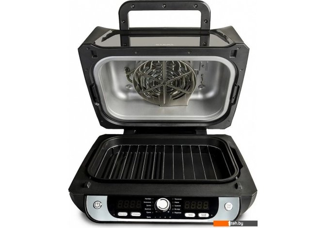| Комплект поставки | Чаша-сковорода с антипригарным покрытием и рельефной поверхностью для жарки, выпечки, тушения и приготовления соусов. Решетка для гриля с антипригарным покрытием. Корзина конвекционная для аэрофритюра, запекания, сушки и приготовления на пару. Решетка-гриль из хромированной стали. Щипцы кухонные для переворачивания и подачи продуктов. Прихватки силиконовые, термостойкие. Щёточка для очистки Крышка с ручкой из нержавеющей стали. |