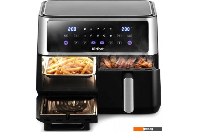 | Информация | - Современный аэрогриль «2 в 1» Kitfort КТ-2256 – это универсальное устройство, которое сочетает в себе функции аэрогриля и духовки, позволяя готовить большинство блюд без масла. - Для приготовления в аэрогриле масло не требуется. Если вы хотите добавить его для создания хрустящей корочки или для аромата, просто слегка смажьте продукты с помощью силиконовой кисточки. - Благодаря системе циркуляции горячего воздуха, продукты равномерно обжариваются со всех сторон, оставаясь нежными внутри и с хрустящей корочкой снаружи. В аэрогриле продукты не пригорают, а процесс готовки не требует постоянного присутствия на кухне. - Устройство оснащено сенсорным управлением и предлагает 10 автоматических программ приготовления, а также функции поддержания температуры и подогрева. Эти программы позволяют использовать готовые настройки, разработанные для конкретных блюд. - Аэрогриль также может служить сушилкой для овощей и фруктов. В нем предусмотрена специальная программа с таймером от 1 до 24 часов и температурой от 50 до 80 градусов, что идеально подходит для сушки. - Главное преимущество этого аэрогриля – наличие двух независимых частей с отдельными нагревателями. Вы можете готовить два разных блюда одновременно, устанавливая для каждого свои настройки температуры и таймера. - В аэрогриле продукты готовятся на специальной решётке, установленной в поддон, а в духовке – на противне или сетке. Все элементы имеют антипригарное покрытие и легко вынимаются для мытья. |