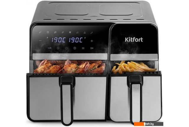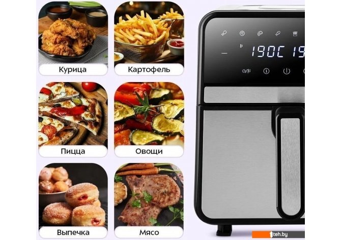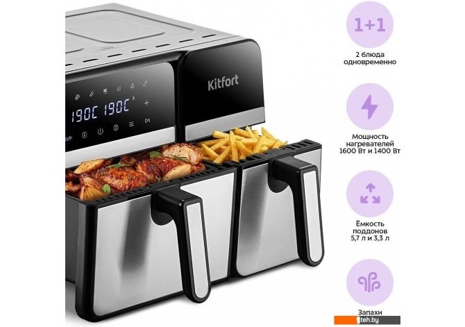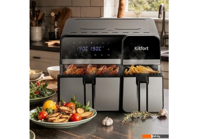 | Информация | Аэрогриль КТ-8149 – это устройство, которое позволяет готовить разнообразные продукты без использования масла, сохраняя их сочность и придавая аппетитную хрустящую корочку. Благодаря аэрогрилю, вы можете наслаждаться вкусными блюдами без лишних жиров. В аэрогриле есть сенсорное управление и 8 режимов приготовления, а также функция поддержания температуры. Эти режимы позволяют использовать готовые настройки, созданные специально для определённых блюд. Вам не нужно следить за процессом приготовления! Главная особенность аэрогриля – возможность готовить сразу 2 блюда одновременно. Аэрогриль оснащён двумя независимыми поддонами ёмкостью 5,7 и 3,3 литра, что позволяет готовить сразу 2 разных блюда с индивидуальными настройками температуры и времени. На КТ-8149 предусмотрена панель управления. Она поможет переключать программы, настраивать температуру, запускать и ставить на паузу работу. КТ-8149 предусматривает опцию «синхронизации», которая служит для одновременного окончания приготовления 2 блюд. Для приготовления пищи используются специальные решётки, которые устанавливаются на поддоны. На решётки и поддоны нанесено покрытие, предотвращающее прилипание продуктов. Поддоны и решётки можно легко извлечь и вымыть. При помощи системы циркуляции горячего воздуха продукты равномерно обжариваются со всех сторон и получаются нежными внутри и хорошо запечёнными снаружи. Во всех программах можно настроить время 1–60 минут и температуру 80–200 °C по своему усмотрению. Читать дальше |