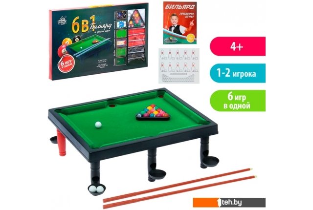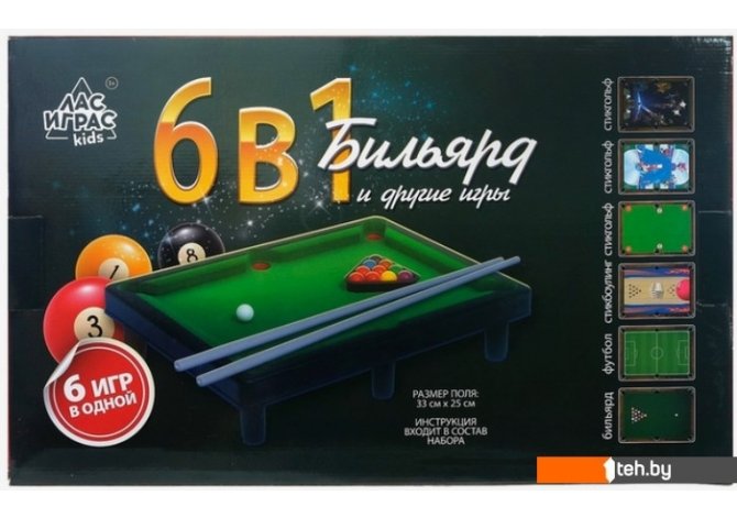 | Комплектация | 5 вариантов игрового поля; стол; 2 кия; шары; правила игры. |