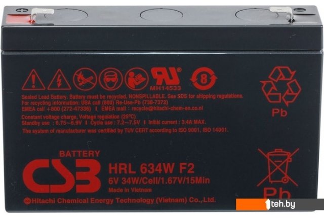 Фотографии, описание и технические характеристики модели CSB Battery HRL634W F2 (6В/9 А·ч) взяты из открытых источников, официального сайта производителя или представительства CSB Battery в Республике Беларусь.