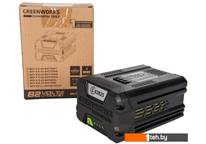 | Комплектация | Аккумулятор GreenWorks 82V, 2.5 А/ч, арт. 2914907 (модель G82B2);Руководство по эксплуатации;Гарантийный талон. |