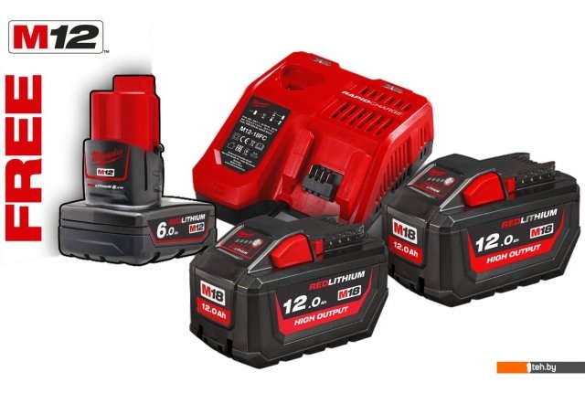 | Комплектация | - Аккумулятор M18 HB12 - 2 шт - Аккумулятор M12 B6 - 1 шт - Быстрое зарядное устройство Milwaukee M12-18 FC - 1 шт - Инструкция по эксплуатации - Поставляется в картонной коробке |