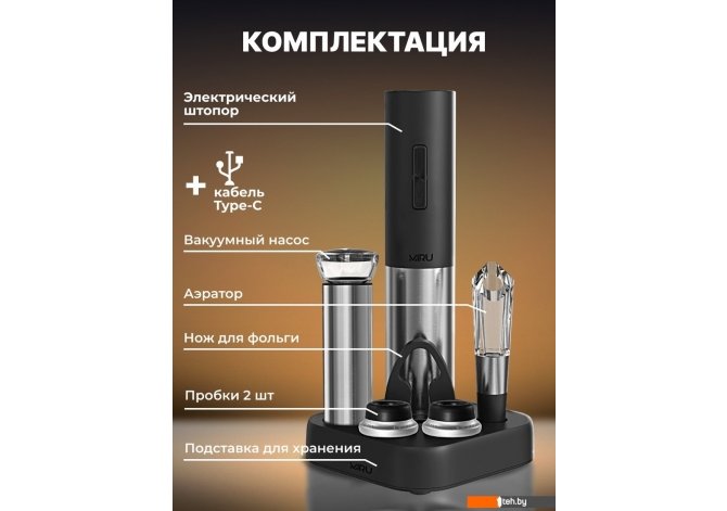 | Информация | Стильный винный набор на удобной подставке для хранения Презентабельный и надежный электроштопор легко откроет бутылку вина за 5 секунд Вакуумный насос с пробками позволит сохранить свежесть вина до 7 дней Пробка с отметками дат позволяет записать дату открытия вина Аэрaтор позволяет изящно наливать вино в бокал и насытить вино кислородом в процессе подачи, чтобы оно в полной мере раскрыло весь свой вкусовой букет Нож для фольги безопасно и удобно удаляет защитную плёнку с горлышка бутылки Электроштопор заряжается с помощью Type-C кабеля Изысканная упаковка, идеальная для подарка |