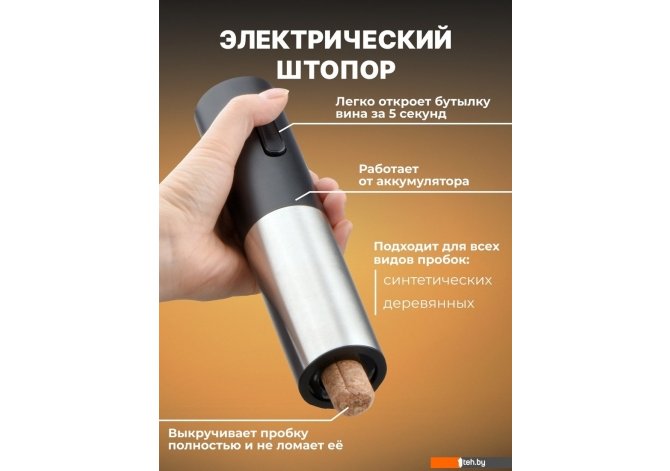 | Состав набора | электроштопор, аэратор, вакуумный насос, нож для горлышка бутылки, пробка для бутылки |