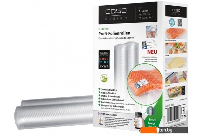 | Информация | Очень прочная и устойчивая к разрыву плёнка толщиной 160 мкмРифлёная структура пакета для создания вакуумаКрепкий и надёжный шовВ комплекте стикеры с QR-кодом для маркировкиВитамины и минералы сохраняются дольшеПлёнка без BPAЗащищает продукты от морозного ожога и потери ароматаВозможно многоразовое использование и мойка в ПММДопускается приготовление продуктов при 100 °C максимум 4 часа и в СВЧ до 70 °CИдеально подходит для Sous VideПодходит для всех бескамерных вакуумных упаковщиковИспользуйте приложение CASO FOOD MANAGER для сканирования стикеров с QR-кодом и маркируете пакеты с продуктами. Таким образом, у вас всегда будет четкое представление о том, что находится в вашем холодильнике или морозильной камере, а так же Вы получите оповещение на свой телефон об окончании срока годности.Составляйте список продуктов с возможностью сортировки по типу продуктов (рыба, мясо, овощи) или месту хранения (холодильник/морозильник/шкаф) |