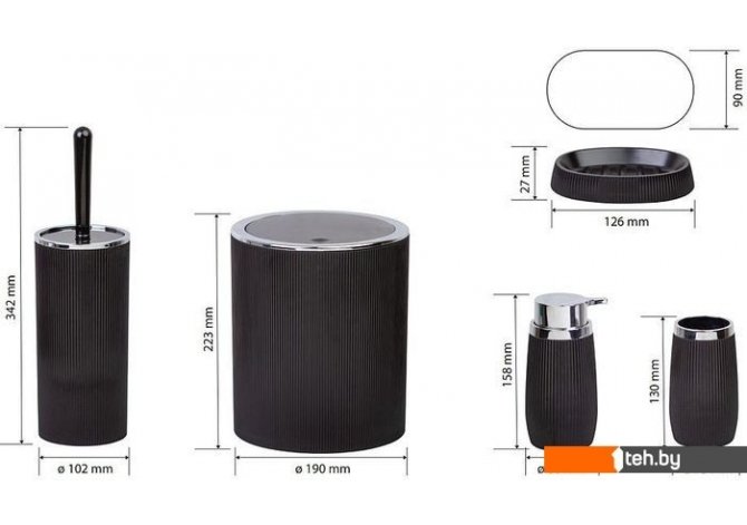 | Комплектация | ведро для мусора, дозатор жидкого мыла, ершик для унитаза, мыльница, стакан для зубных щеток |