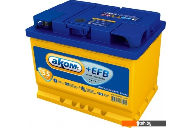 Фотографии, описание и технические характеристики модели Автомобильного аккумулятора AKOM +EFB 55 (55 А·ч) взяты из открытых источников, официального сайта производителя или представительства AKOM в Республике Беларусь.