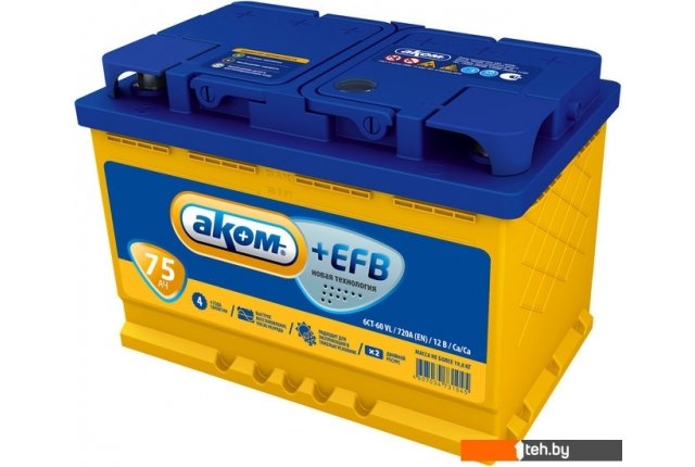 Если хотите купить автомобильный аккумулятор AKOM +EFB 75 (75 А·ч) то следует уточнить все параметры и габариты модели перед покупкой. Представленые характеристики на сайте 1teh.by могут отличаться от действительных или указанных производителем. Описание, фото товара и технические характеристики представлены для справки.