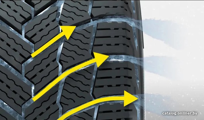 Информация | - Увеличенная ширина водоотводных каналов:Для эффективной эвакуации снега и воды из пятна контакта.- Ламели глубокой нарезки:Ламели переменной толщины. Помогают выводить водяную пленку на льду и служат для более эффективного сцепления на снегу.П-образные ламели. Сохраняют необходимую жесткость блока при маневрировании.- Дополнительные микронеровности в протекторном слоеОни обеспечивают эффективную работу на снегу и абсорбируют водяную плёнку на льду. |