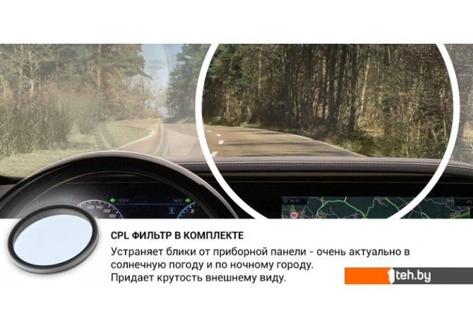 | Комплектация | - видеорегистратор; - камера заднего вида с креплением; - кабель для камеры заднего вида; - поляризационный фильтр (CPL); - крепление на присоске; - доп. крепление на 3М скотче; - автомобильное зарядное устройство; - салфетка для линзы и экрана. |