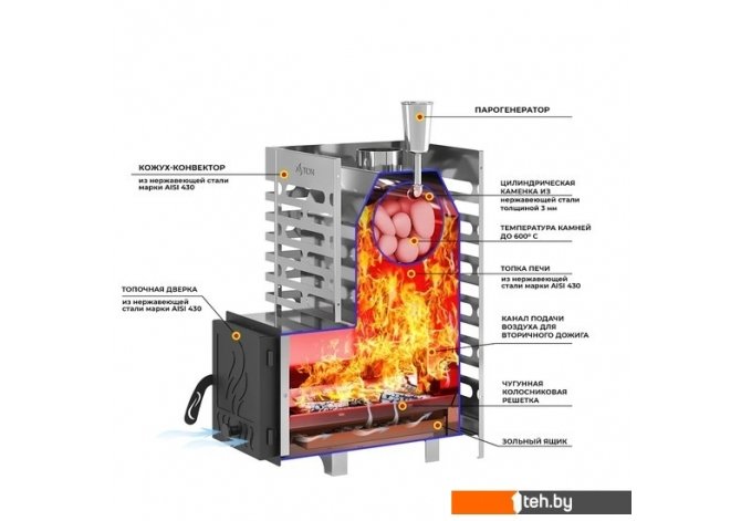 | Информация | Главное: Печь ASTON из нержавеющий стали марки AISI 430 устойчива к окислению и прогару. Сваренные роботом швы обеспечивают отличное качество печи. Печь быстро нагревается и легко отдаёт тепло заложенным в закрытую и открытую каменки камням. Канал для вторичного дожига делает горение топлива максимально эффективным. Заклад до 30 килограммов камня для бани в закрытой каменке позволяет получать мелкодисперсный пар в режиме русской бани. Стальной кожух открытой каменки вмещает в себя до 160 килограммов банного камня. Стеклянная или глухая дверки помогают обслуживать топку и регулировать скорость горения топлива в печи. Линейка печей ASTON из нержавеющей стали рассчитана на установку в парные объёмом от 6 до 22 м3. |