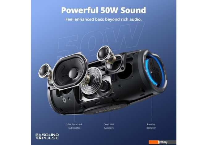 | Информация | ??Текст описания переведен при помощи искусственного интеллекта. - Наслаждайтесь богатым и детализированным звуком: 30-ваттный сабвуфер и два 10-ваттных твитера обеспечивают насыщенное и детализированное звучание без искажений. - Мощный звук 50 Вт с улучшенными басами: Почувствуйте мощный 50-ваттный звук даже на улице. Нажмите кнопку SoundPulse для усиления басов. - Выдвижная ручка: Поднимите выдвижную резиновую ручку, чтобы носить музыку куда угодно, или просто положите её горизонтально, чтобы она поместилась в любом месте. - 20 часов воспроизведения с встроенным Powerbank: Наслаждайтесь непрерывной музыкой с утра до вечера. Когда вам это нужно, подключите USB-порт для зарядки ваших устройств. - Водонепроницаемость IPX7: Смело брызгайте или даже танцуйте под дождем с водонепроницаемостью IPX7. - Ваш уникальный стиль: Настройте эквалайзер через приложение, чтобы получить звук, который подходит только вам. А также соедините 2 колонки, чтобы погрузиться в атмосферу стереозвука. |
