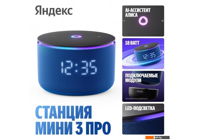 Фотографии, описание и технические характеристики модели портативной колонки Яндекс Станция Мини 3 Про (синий) взяты из открытых источников, официального сайта производителя или представительства Яндекс в Республике Беларусь.