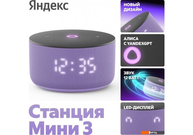 Фотографии, описание и технические характеристики модели портативной колонки Яндекс Станция Мини 3 с часами (фиолетовый) взяты из открытых источников, официального сайта производителя или представительства Яндекс в Республике Беларусь.