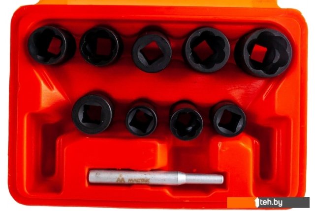 | Комплектация | - Головки, 9 шт: 10, 11, 12, 13, 14, 15, 16, 17, 19 мм; - Выколотка 8 мм - 1 шт; - Кейс. |