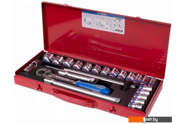 | Комплектация | Головки короткие 12-гранные: 10, 11, 12, 13, 14, 15, 16, 17, 18, 19, 20, 21, 22, 23, 24, 27, 30, 32 мм Трещотка флажковая: 32 зубца, 250 мм Вороток скользящий Т-типа: 250 мм Удлинители: 125, 250 мм Кардан: 77,5 мм |