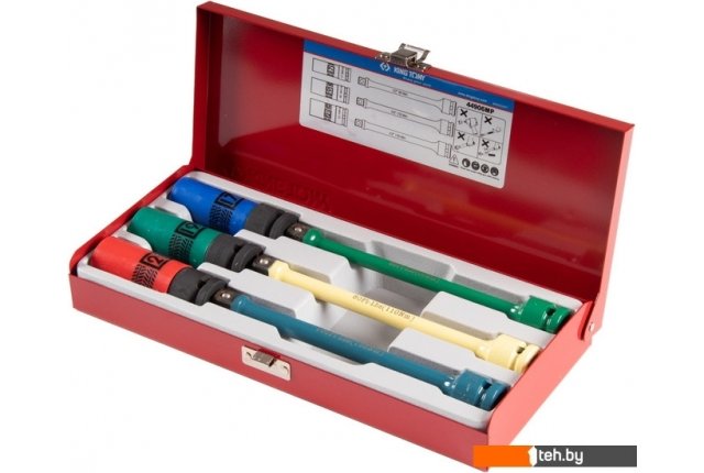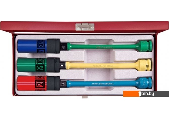 | Комплектация | Головки торцевые ударные глубокие тонкостенные с пластиковой защитой — 17, 19, 21 мм (4945M). Удлинитель торсионный с ограничителем крутящего момента 90 Нм, длина 195 мм (4269-08-90). Удлинитель торсионный с ограничителем крутящего момента 110 Нм, длина 195 мм (4269-08-B0). Удлинитель торсионный с ограничителем крутящего момента 135 Нм, длина 195 мм (4269-08-D5). Металлический кейс. |