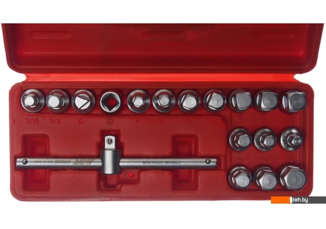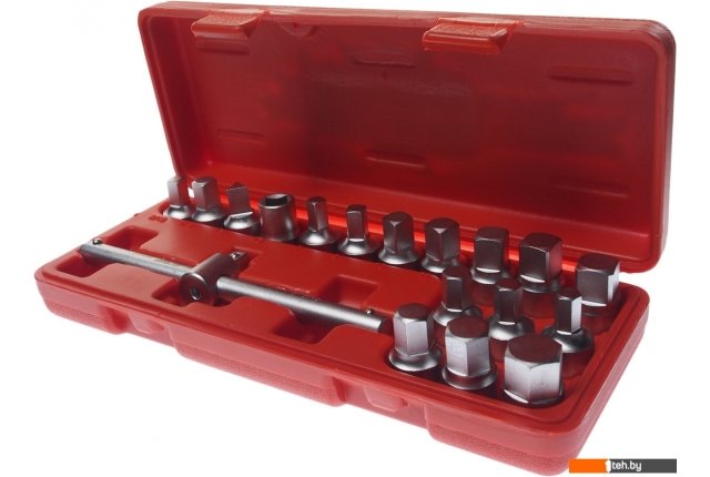 | Комплектация | - головки (17 шт.) 5/16", 3/8", квадрат, треугольник, 7, 8, 10, 11, H10, H9, H8, H12, H14, H17. - вороток - пластиковый кейс. |
