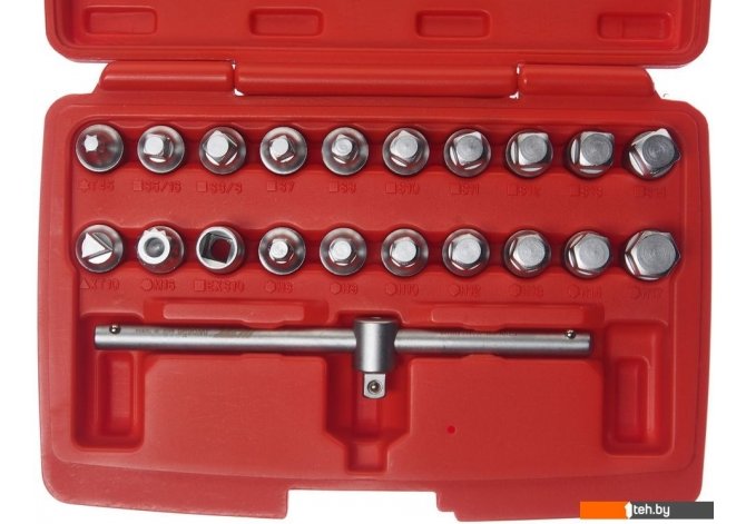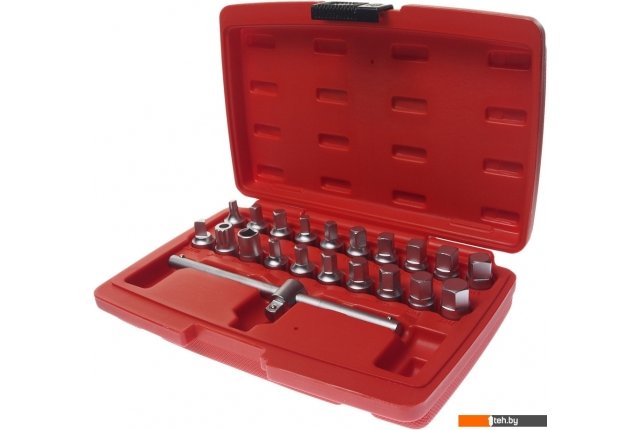 | Комплектация | - головки (20 шт.) Т45, S5/16, S3/8, S7, S8, S10, S11, S12, S13, S14, XT10, M16, EXS10, H8, H9, H10, H12, H13, H14, H17. - вороток - пластиковый кейс. |