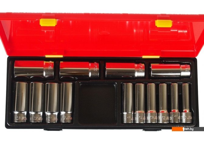 | Комплектация | - 6-гранные головки глубокие: 10, 11, 12, 13, 14, 17, 19, 21, 22, 23, 24, 27, 30, 32 мм. - 14 шт. - кейс |
