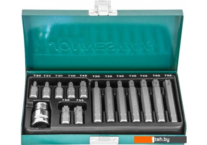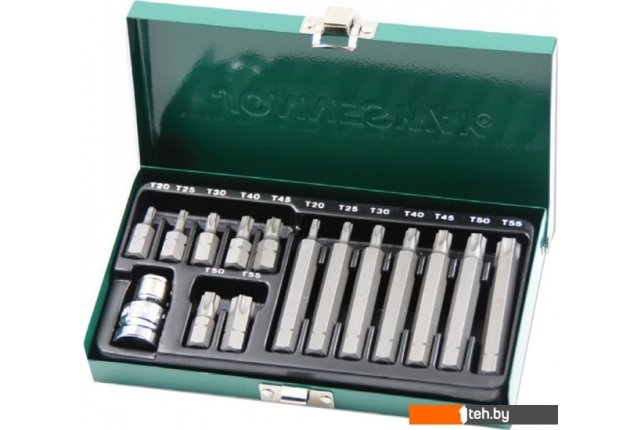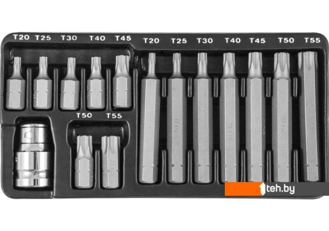 | Комплектация | Вставки-биты с хвостовиком 10 мм.: - Вставки биты TORX®, L=30 мм, 7 шт.: Т20, Т25, Т30, Т40, Т45, Т50, Т55; - Вставки биты TORX®, L=75 мм, 7 шт.: Т20, Т25, Т30, Т40, Т45, Т50, Т55; - Адаптер для вставок-бит 1/2”DRх10 мм.; - Металлический бокс. |