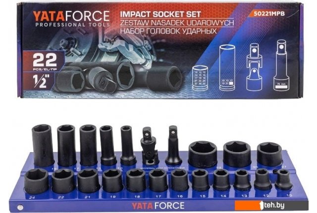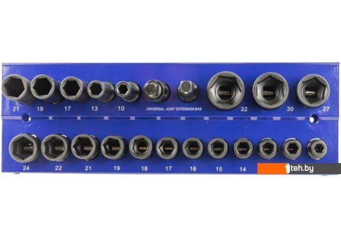 | Комплектация | головки короткие (10, 12, 13, 14, 15, 16, 17, 18, 19, 21, 22, 24, 27, 30, 32 мм), головки глубокие (10, 13, 17, 19, 21 мм), адаптер, удлинитель |